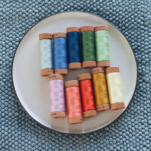 This set contains 10 spools (300 yards each) of my favorite and most essential colors. Anytime I put together a set of something, I try to cover as many bases as possible. The fineness of the thread means fewer colors cover more bases, and this group aims to cover all of the important ones. The set works well with many projects and--of course--my fabrics. Plus, the small spool size is perfect for travel!