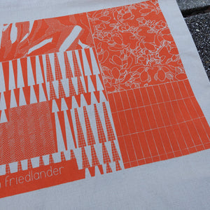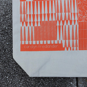 This canvas tote bag measures 15" x 15" x 5" and is perfect for carrying all of your essentials with ease. The bright design is a riotous mix of my fabric and pattern designs in an exuberant orangey-red color.