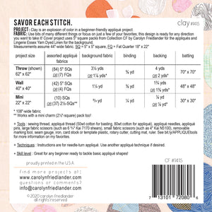 Clay is an explosion of color in a beginner-friendly appliqué project. Regardless of skill level, anyone can explore their own composition through color, shape and layers.