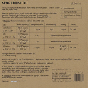 This appliqué project is great for all skill levels and any color and/or fabric enthusiast. It's charm-square friendly, making it a super easy project for achieving a little bit of many different fabrics. Raid your stash or pick up a pretty pre-cut pack.
