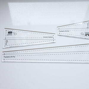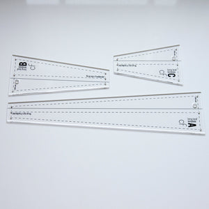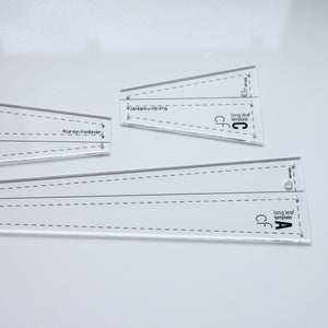 Long Leaf Acrylic Template Set is perfect for use on their own or with my Long Leaf and Frond Quilt Patterns. This 3-piece template set features shapes to make the projects with the 1/4" seam allowance included. Templates are made from sturdy acrylic, and each features drilled holes and printed markings so you can cut and mark at the same time. Rotary cutter friendly!