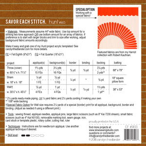 3 project size options, how-to instructions, pillow sham finishing, how-to make a hanging sleeve, and directions for incorporating a border-motif fabric